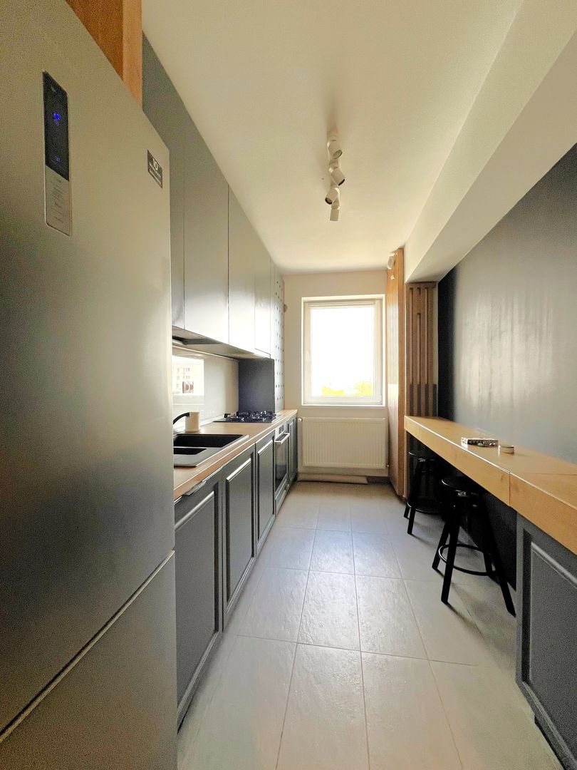 Bucataria, complet mobilata si utilata, se afla intre cele doua camere. Dispune de masina de spalat vase, printre altele, iar centrala termica se afla tot aici. Am uitat sa precizam un aspect importanat pentru cei pasionati de gatit: BUCATARIA ESTE INCHISA.