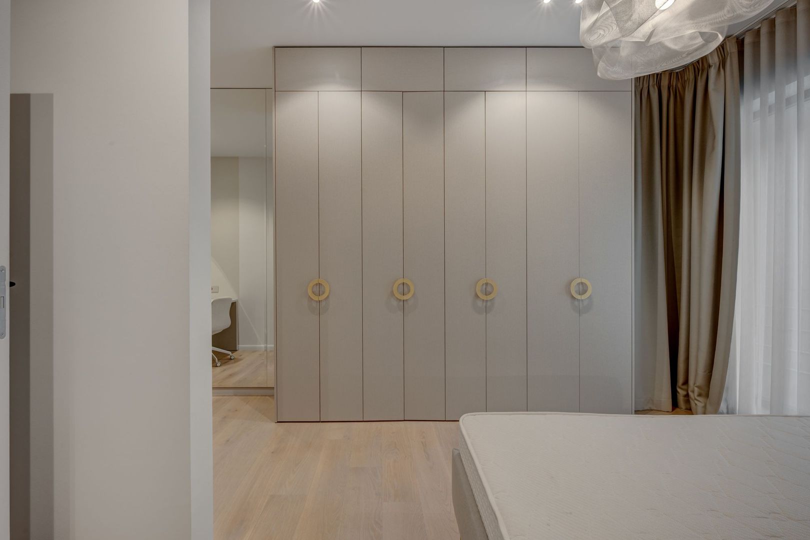 Din cadrul unui hol de delimitare se acceseaza si cele doua dormitoare, destul de echilibrate, la randul lor, ca spatiu, fiecare desfasurandu-se in 15 mp plus. Se remarca totusi, ca dormitor principal, camera ce beneficiaza si de un dressing spatios, de 4 mp, integrat excelent.