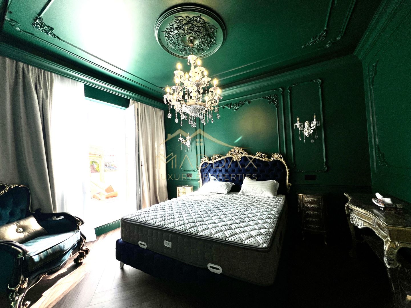 Locuința se remarcă printr-un design rafinat, cu accente regale și finisaje atent alese. Livingul si dormitorul sunt vedetele acestui apartament: pereți în tonuri închise, decorațiuni clasice, candelabre cu cristale și mobilier de inspirație barocă, ce creează o atmosferă sofisticată și exclusivistă. Este o proprietate care spune o poveste și oferă o experiență de locuire aparte, potrivit pentru cei care caută mai mult decât un simplu spațiu de închiriat.
