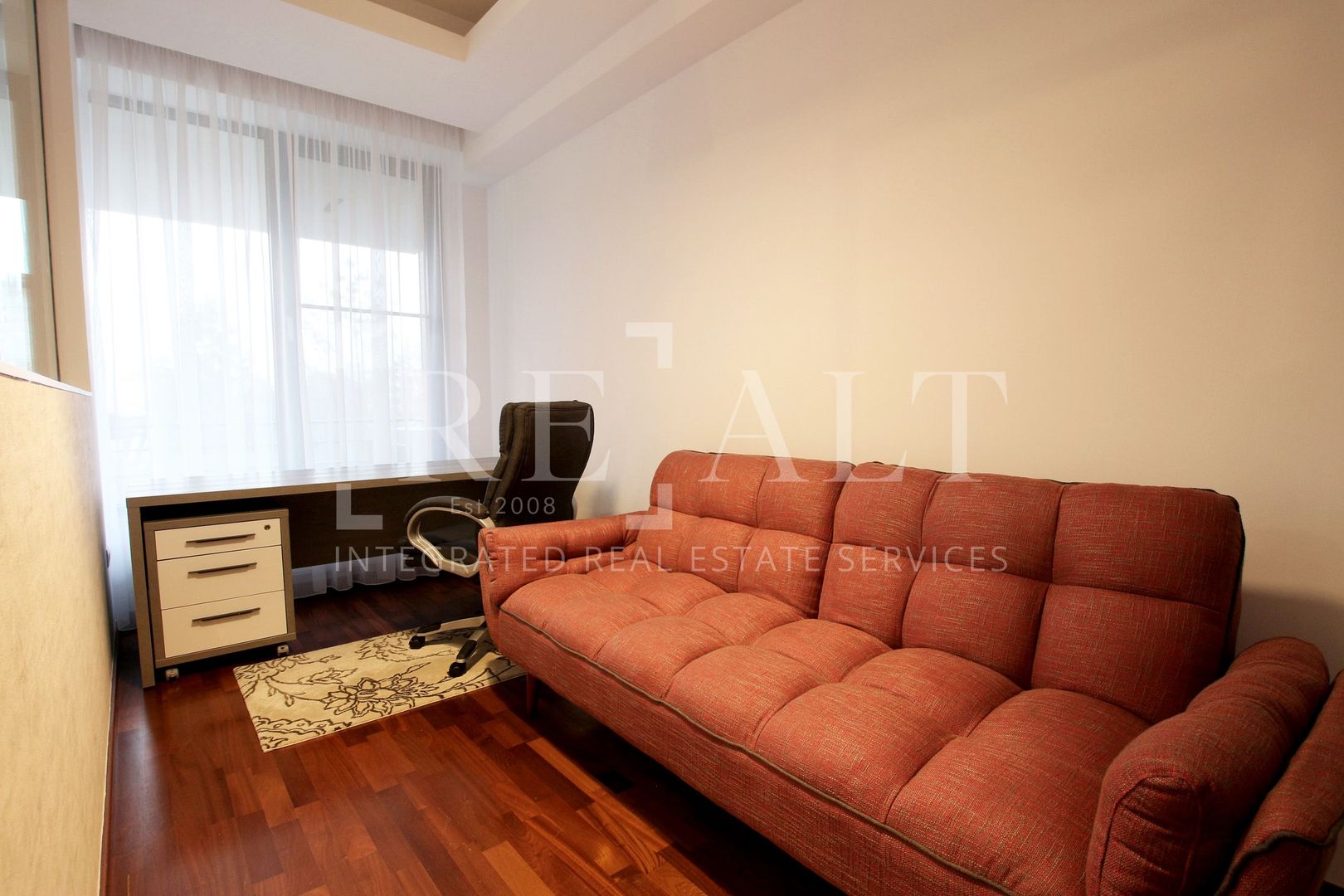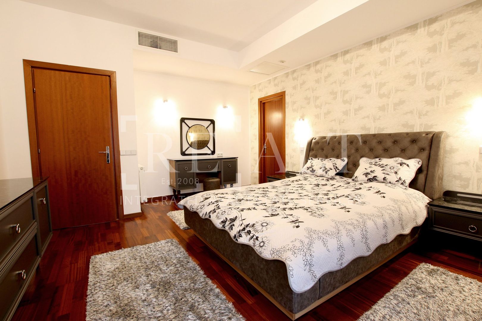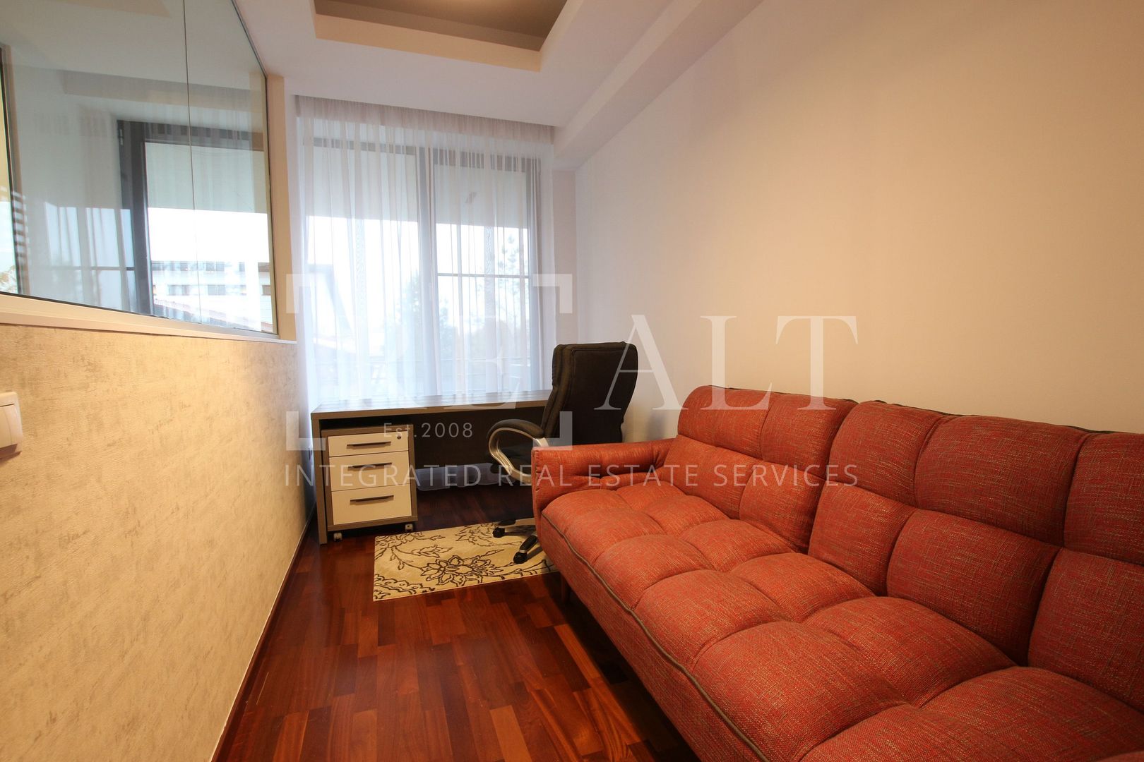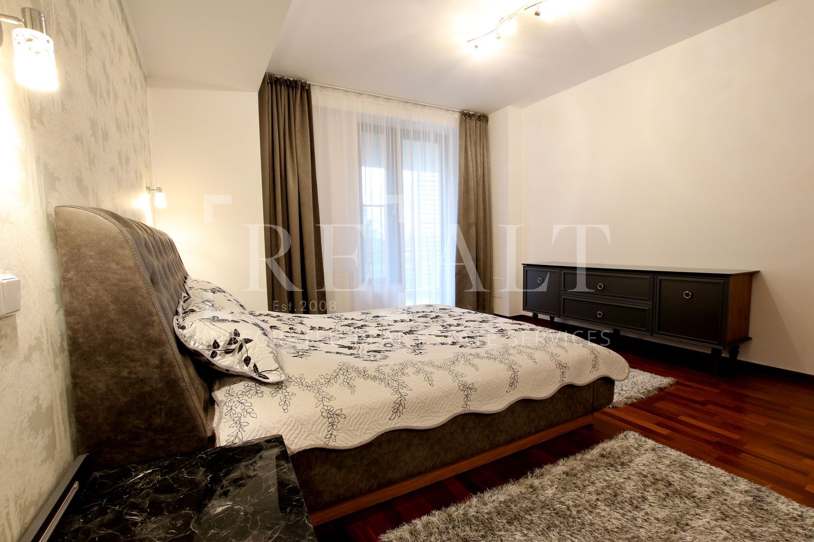 Apartamentul este situat la etajul 2 intr-un imobil P+10 si este de tip semidecomandat. Suprafata utila a acestuia este de 110 mp, la care se adauga o terasa in suprafata de 18mp. Livingul are o suprafata generoasa, iar bucataria de tip open space mareste si mai mult spatiul acestuia. De aici se face accesul spre terasa mobilata cu masute si scaune de exterior. Livingul este impartit in zona de relaxare si zona de dining. Dormitorul matrimonial are atribuit un dressing si un grup sanitar propriu, apartamentul mai avand un al doilea grup sanitar de serviciu pentru invitati.
