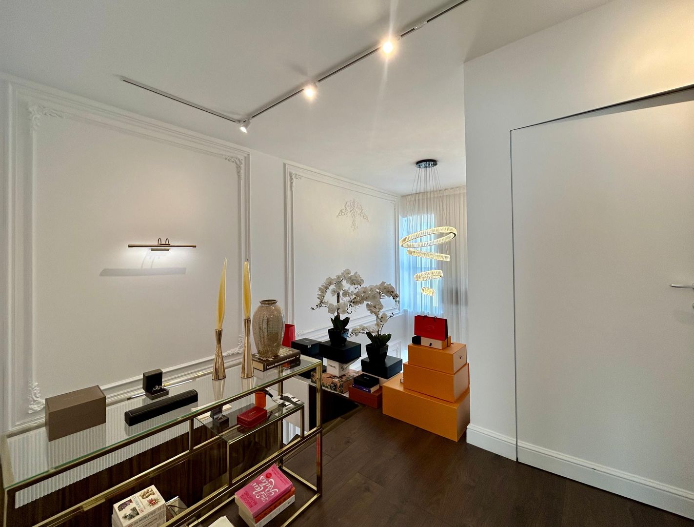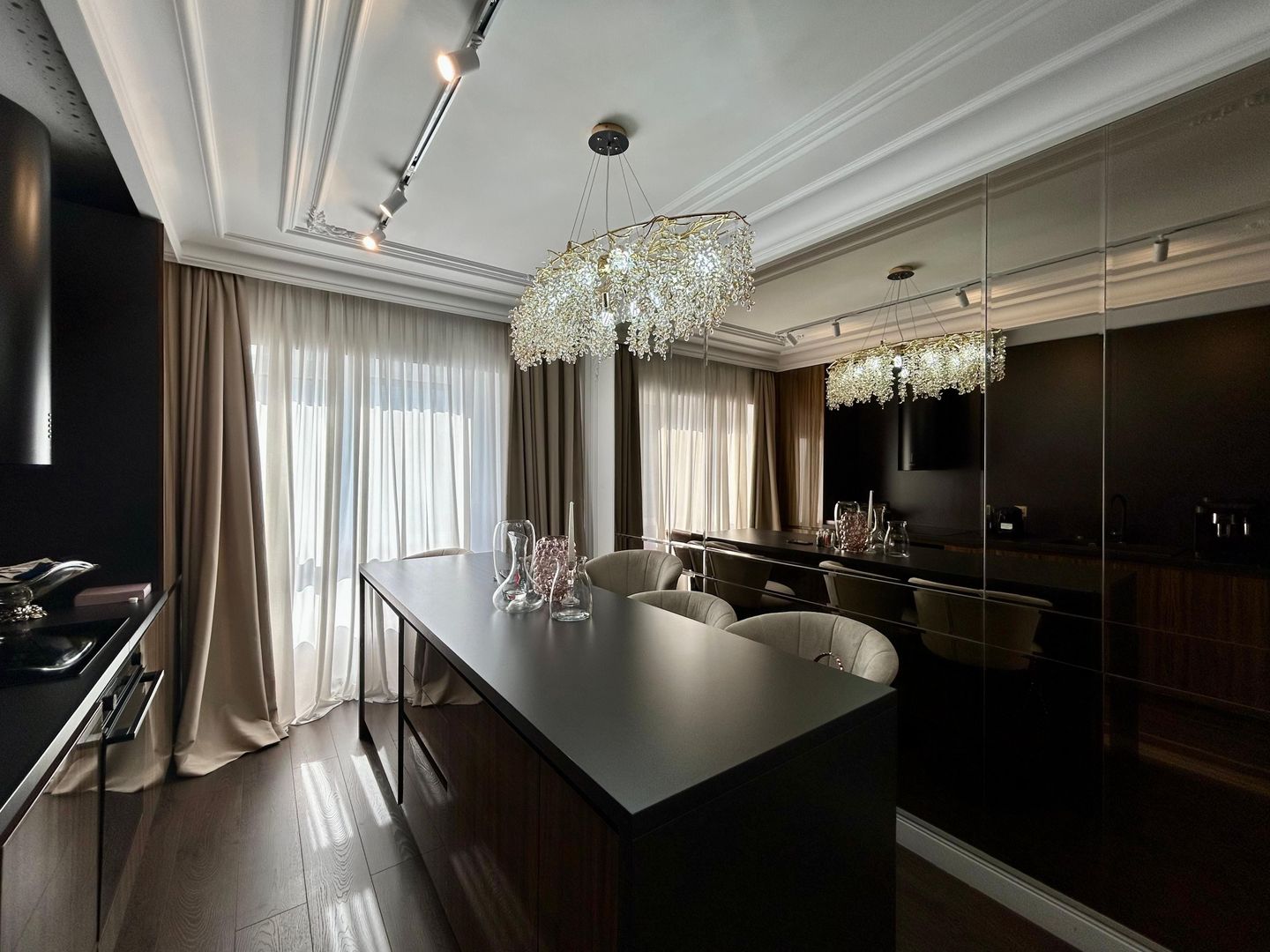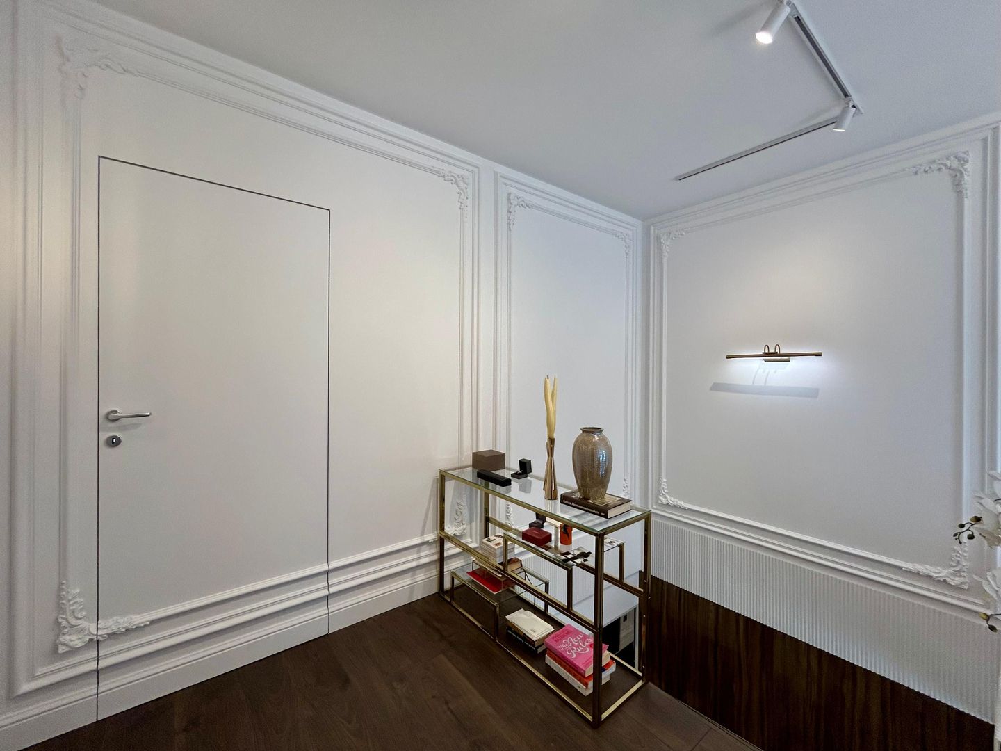 Interiorul impresionează încă de la intrare prin detaliile arhitecturale fine – stucaturile atent lucrate și corpurile de iluminat sculpturale conferă un aer de noblețe spațiului. Livingul generos, inundat de lumină naturală filtrată prin draperii diafane, este nucleul casei: un loc de întâlnire unde simplitatea liniilor moderne se completează armonios cu accentele clasice.