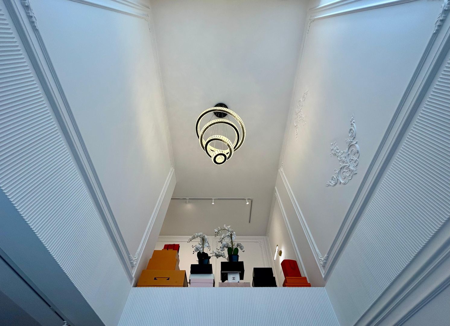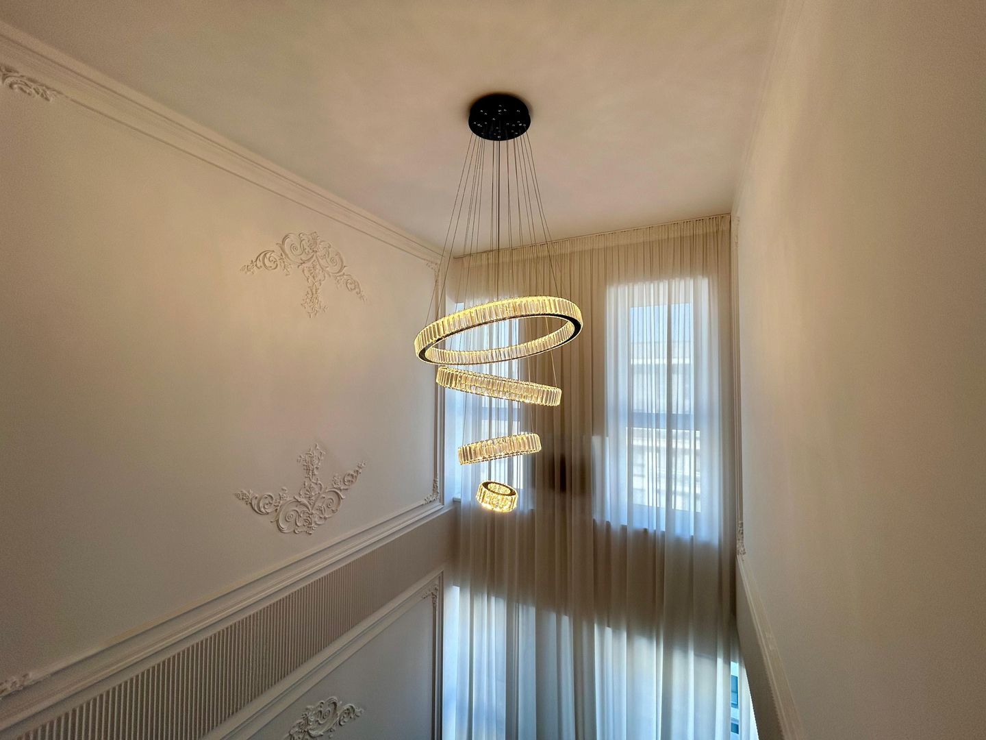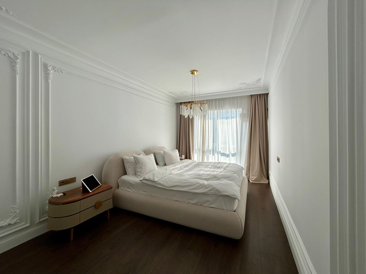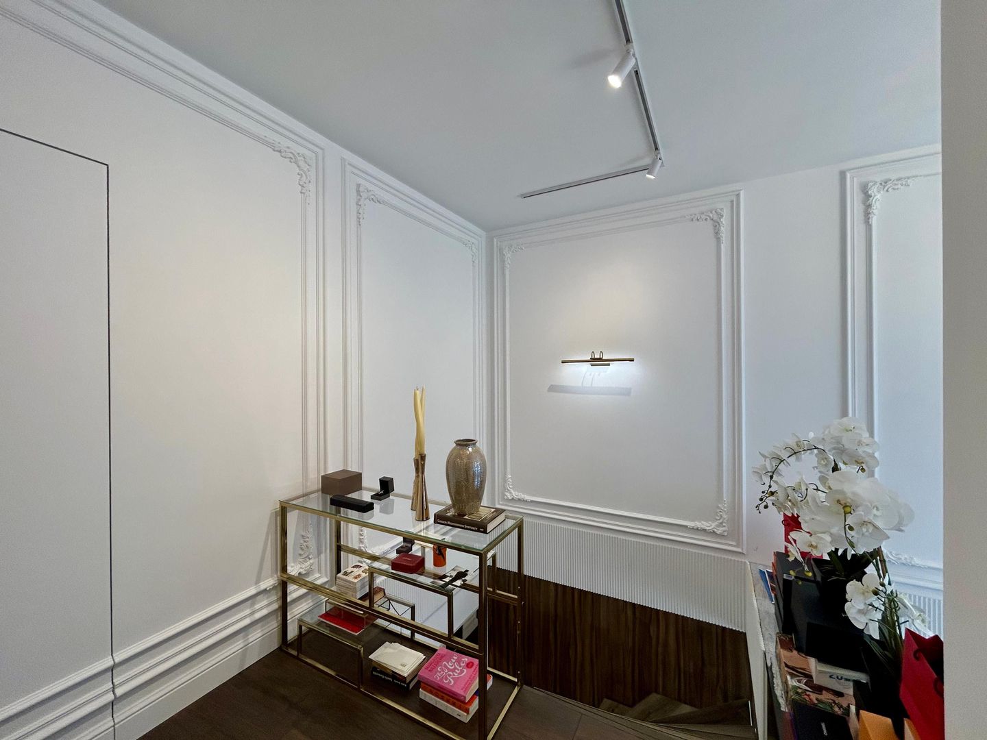 Interiorul impresionează încă de la intrare prin detaliile arhitecturale fine – stucaturile atent lucrate și corpurile de iluminat sculpturale conferă un aer de noblețe spațiului. Livingul generos, inundat de lumină naturală filtrată prin draperii diafane, este nucleul casei: un loc de întâlnire unde simplitatea liniilor moderne se completează armonios cu accentele clasice.