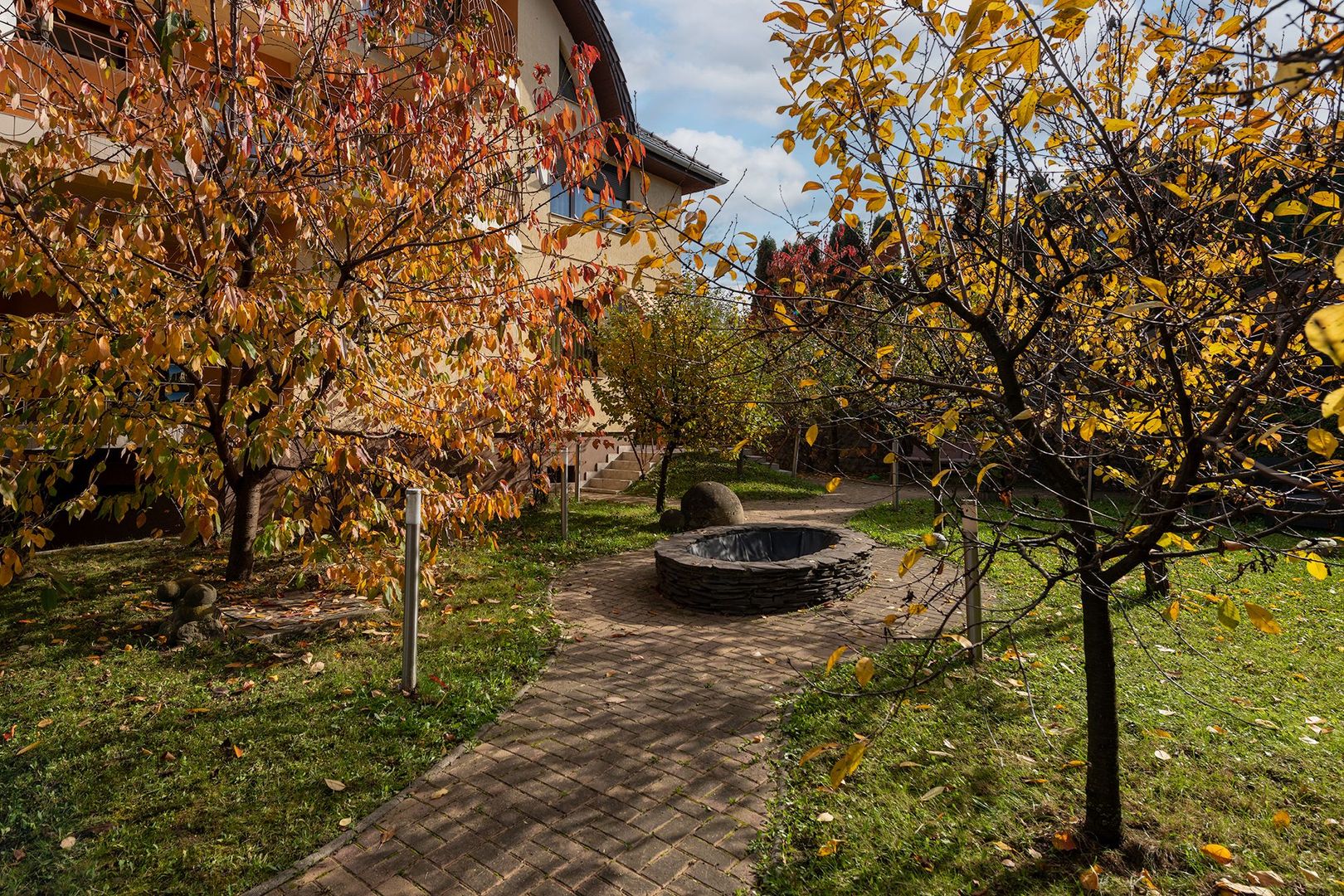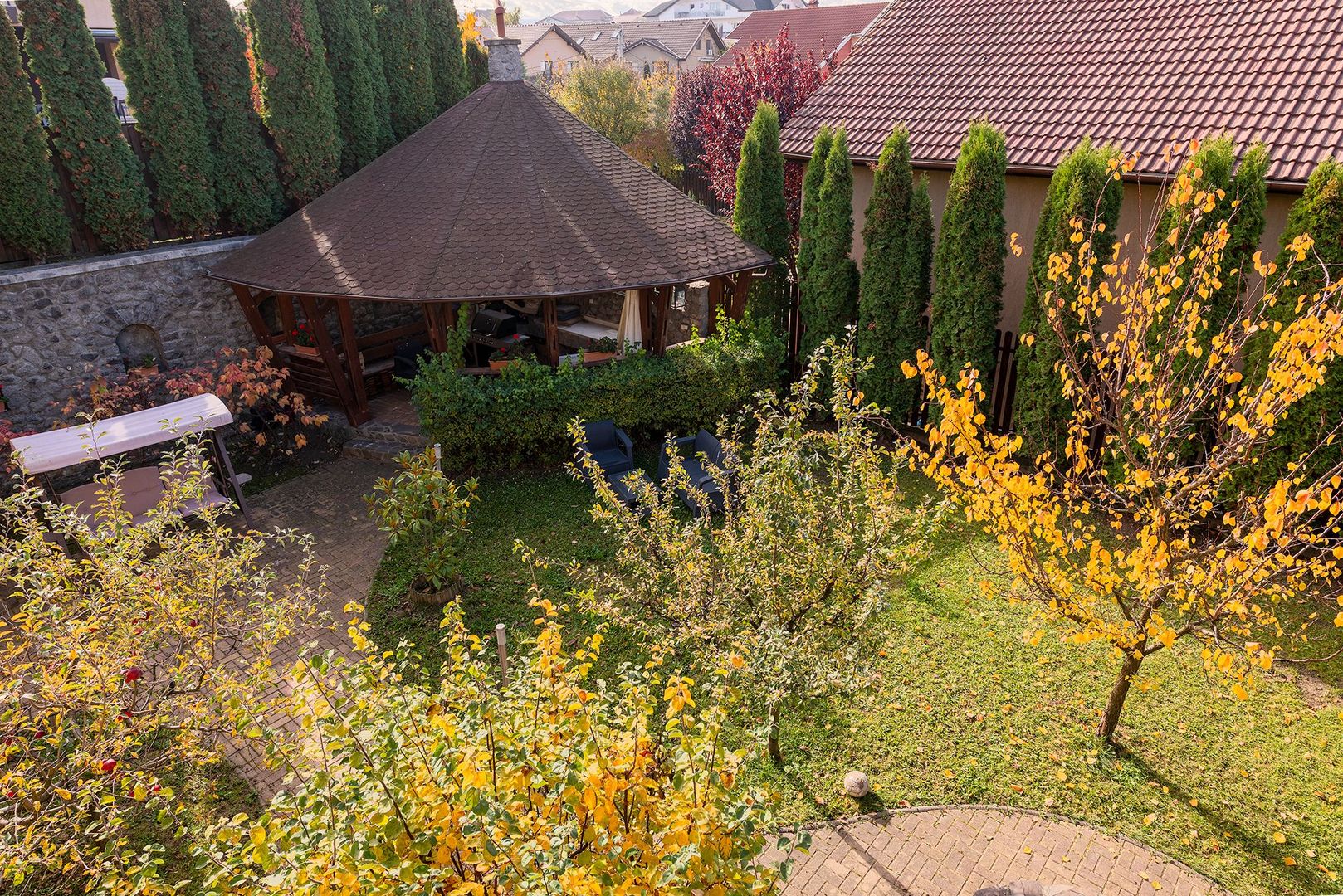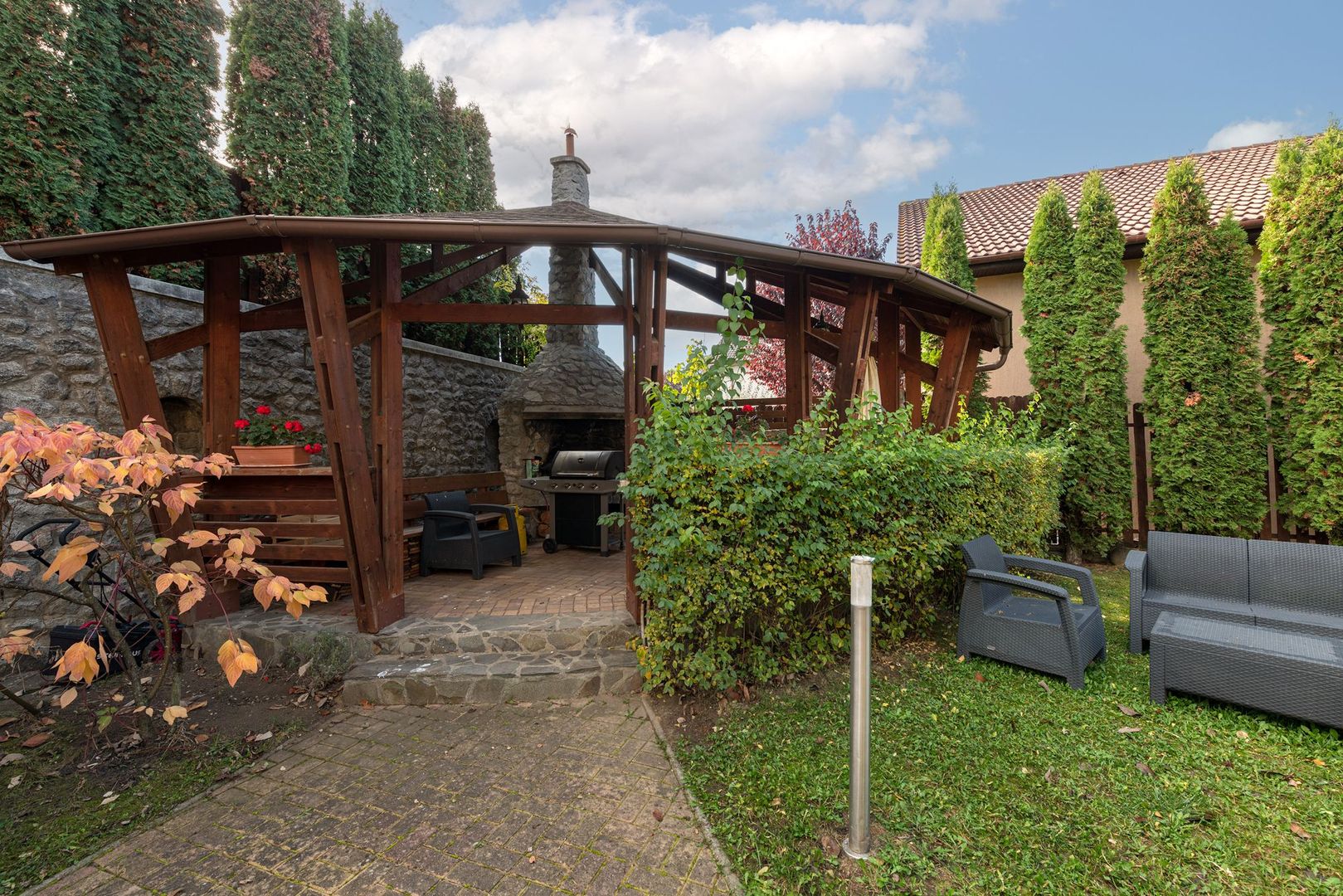 Curtea generoasă este plină de pomi fructiferi de toate soiurile, creând o ambianță intimă și un sentiment de relaxare. Un foișor de 40 mp e refugiul familiei în zilele călduroase de vară.