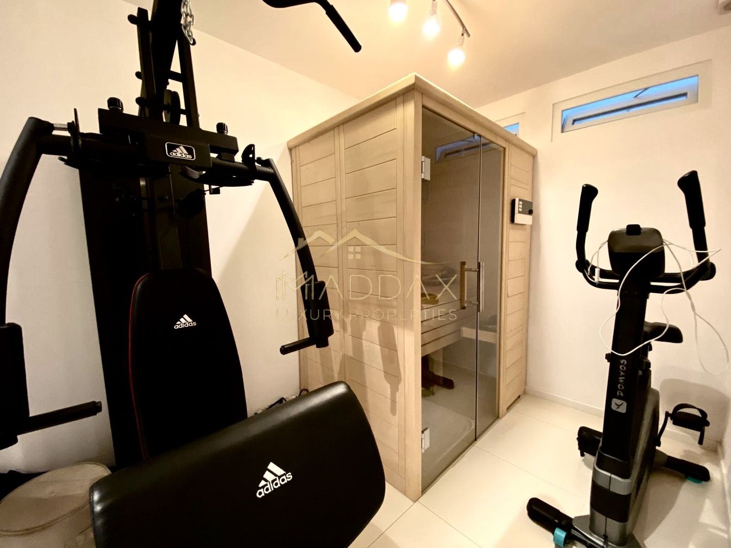 Parterul găzduiește, pe lângă living, o bucătărie complet echipată, un birou privat, o sală de fitness cu saună, ideală pentru momente de relaxare, dar și un dormitor de oaspeți perfect pentru musafiri sau bonă. Garajul integrat asigură acces facil și protejat, iar în fața vilei există 4 locuri de parcare, plus spații pentru vizitatori.