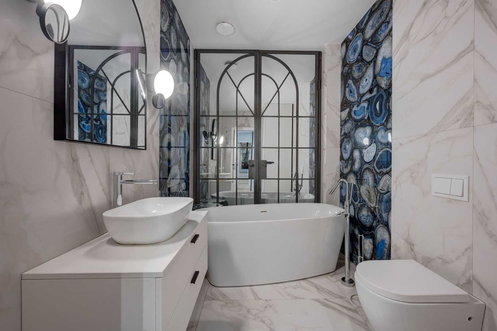 Baia se afla la intrarea in apartament. Finisajele si culorile alese te fac sa crezi ca te afli intr-o incapere din revistele de arhitectura si design interior.