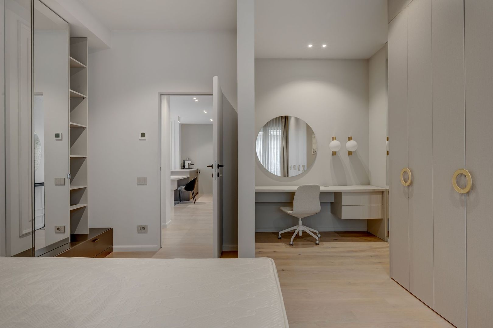 Din cadrul unui hol de delimitare se acceseaza si cele doua dormitoare, destul de echilibrate, la randul lor, ca spatiu, fiecare desfasurandu-se in 15 mp plus. Se remarca totusi, ca dormitor principal, camera ce beneficiaza si de un dressing spatios, de 4 mp, integrat excelent.