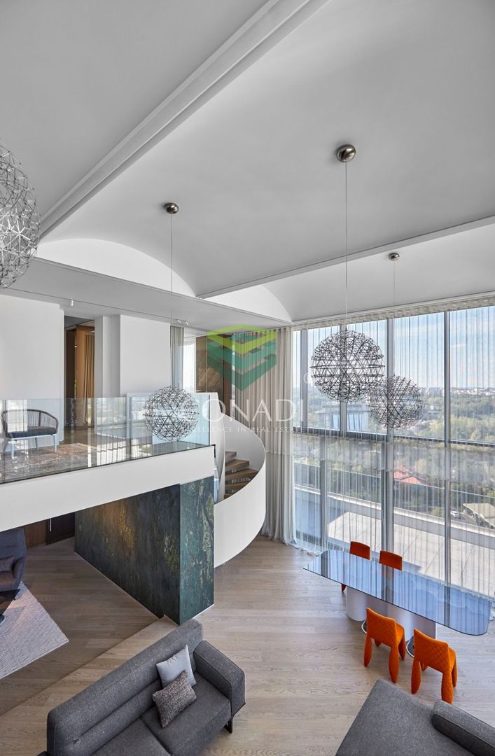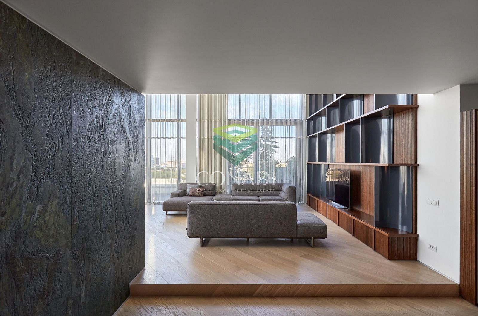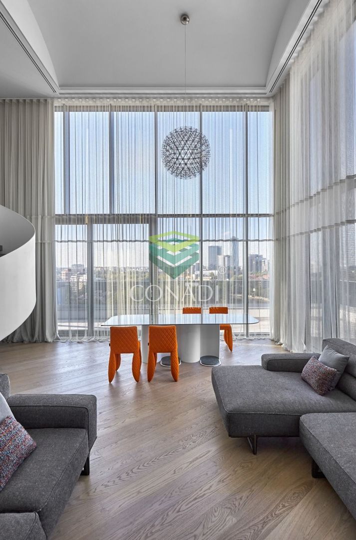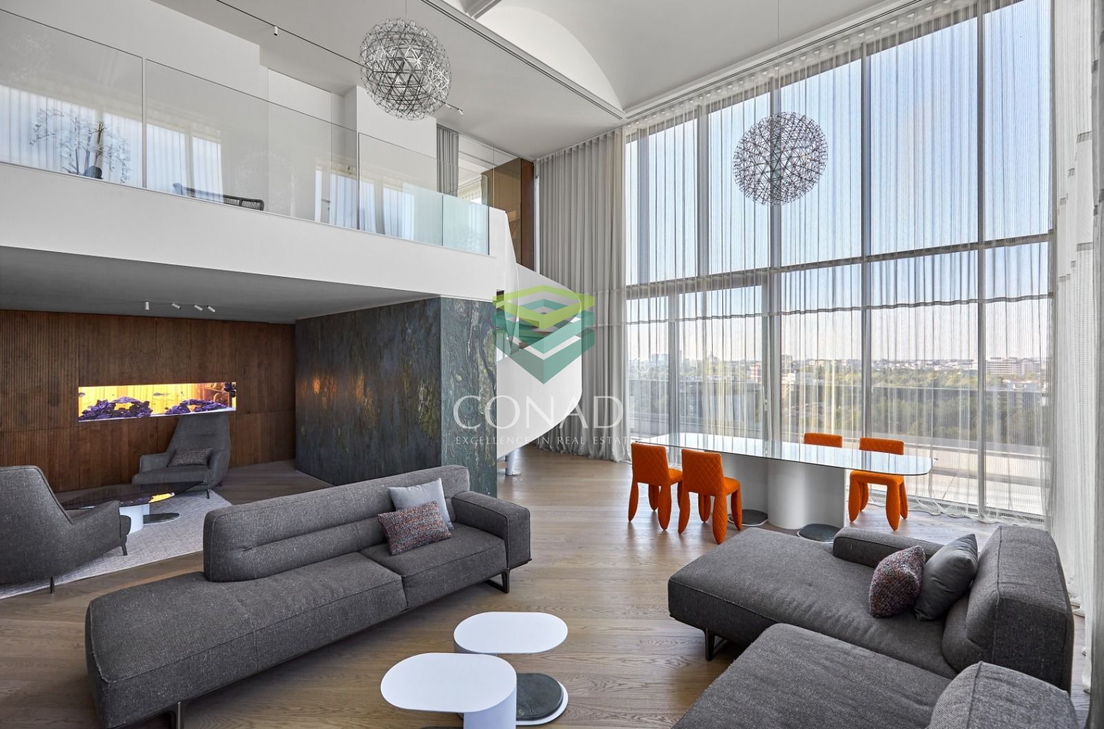 Impozant penthouse duplex, complet mobilat, cu vedere panoramică magistrală asupra Bucureștiului. Reședința îmbină volume generoase cu mobilier și finisaje de înaltă clasă, oferind un cadru rafinat pentru locuire reprezentativă și recepții.