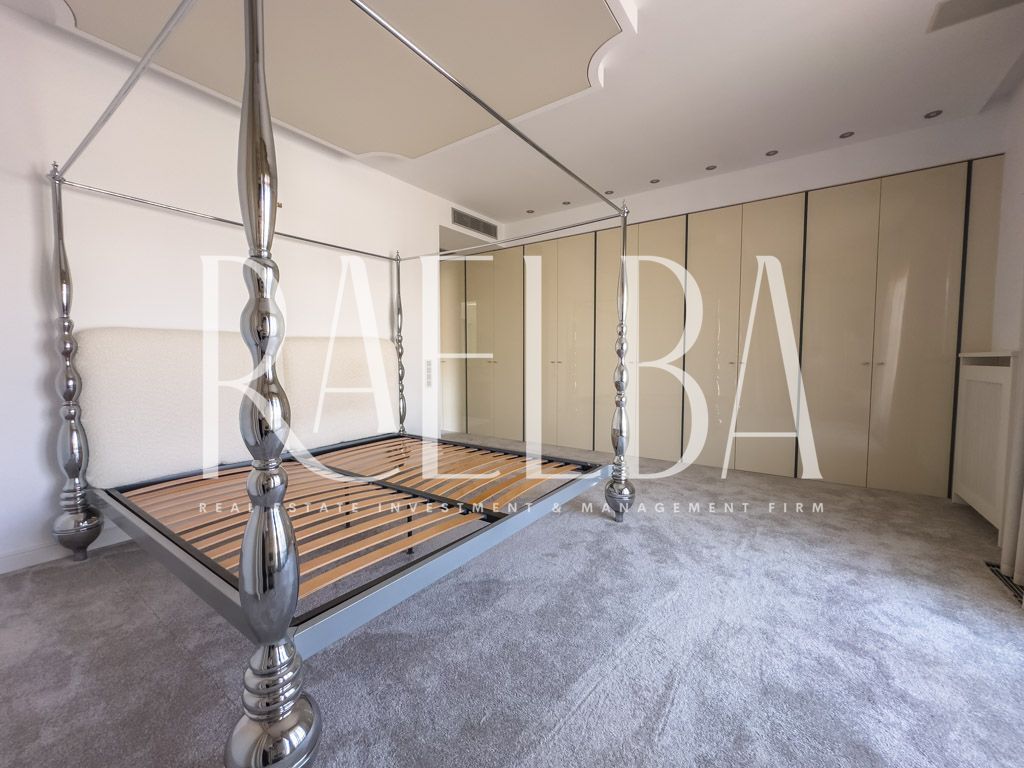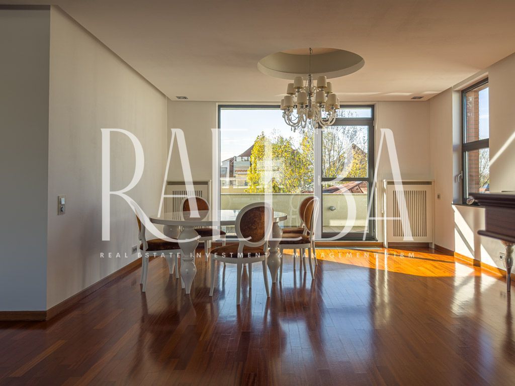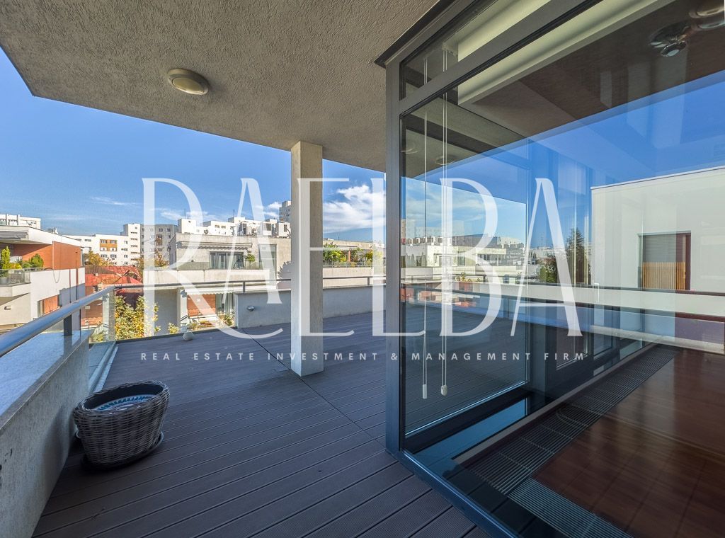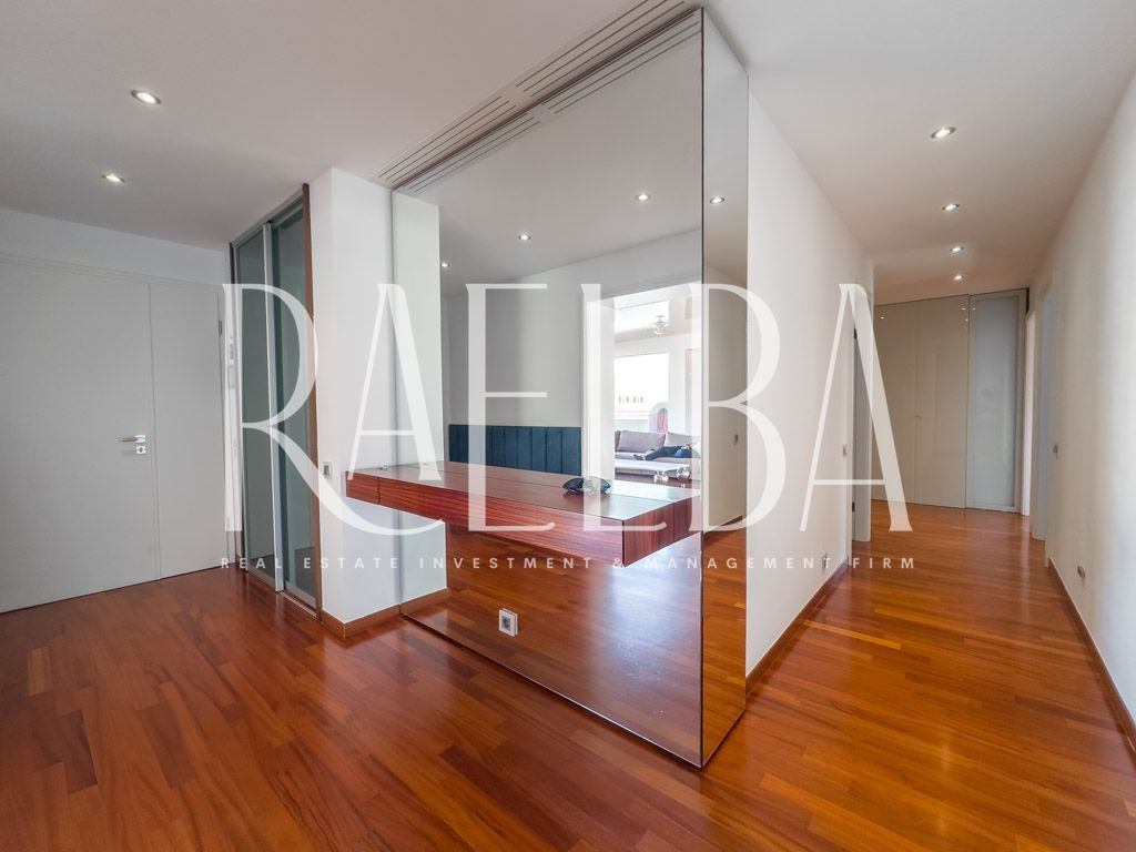 Proprietatea propusă spre închiriere se desfășoară integral pe un singur nivel, cu o suprafață utilă de 215,58 mp și 86,43 mp de terase orientate pe trei laturi. Livingul este completat de o zonă de dining și o bucătărie separată. Zona de noapte cuprinde două dormitoare, fiecare cu baie proprie, o a treia baie suplimentară, al treilea dormitor transformat în dressing și un laundry room. Finisajele sunt premium, iar lumina naturală definește spațiul pe tot parcursul zilei. Mobilarea se poate adapta în funcție de preferințele viitorului chiriaș.
