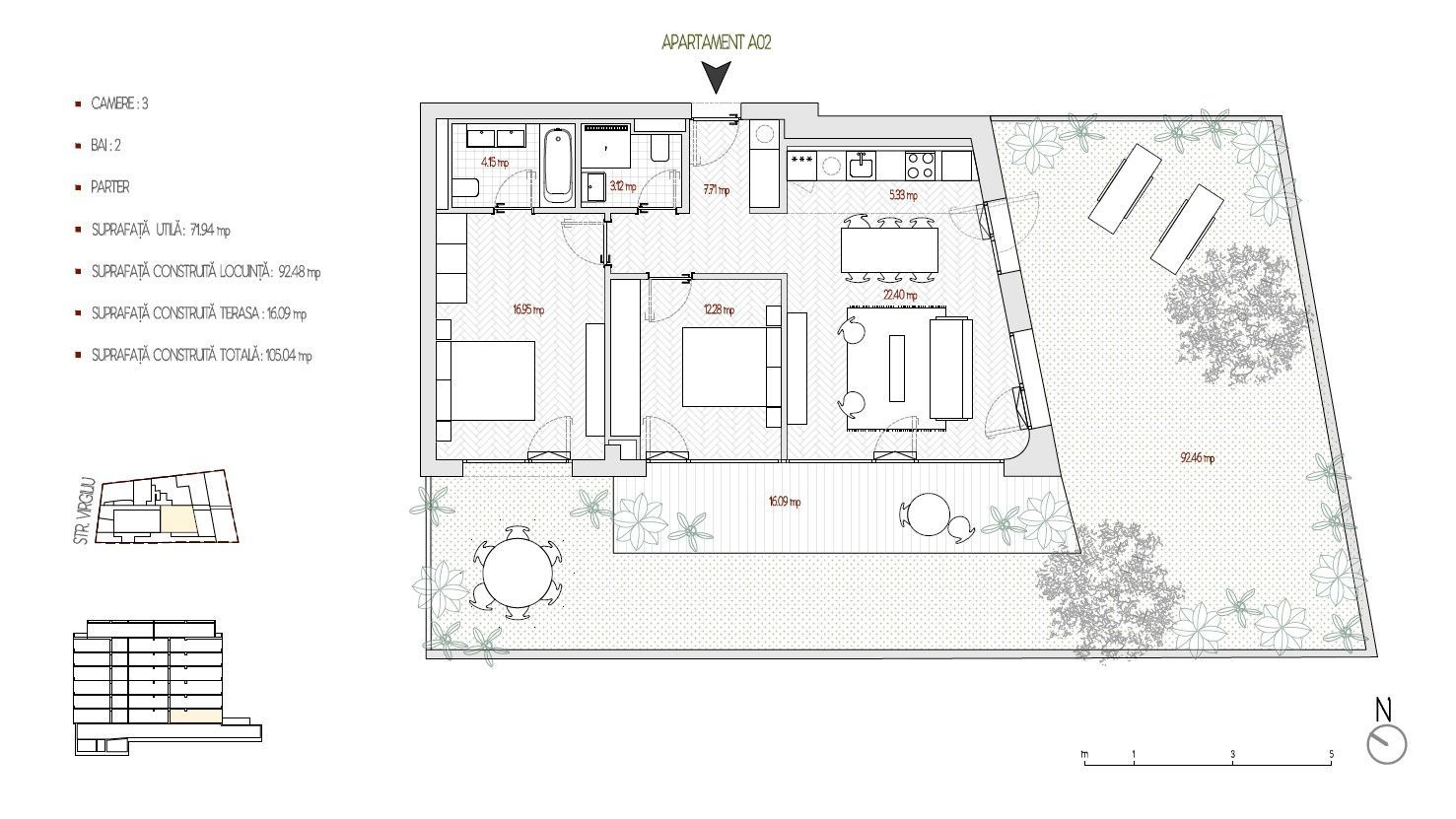 - suprafață utilă 71.3 mp + 1 terasa de 16.09 mp + gradina intima de 92.48 mp