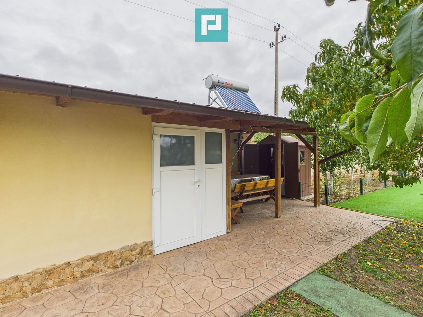 Foișor mic pentru servirea mesei, lângă, o cabină de duș dotată cu instalație tip panou încălzire solară.