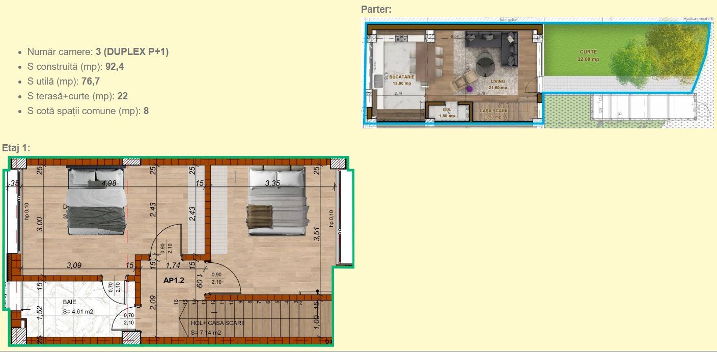 Suprafata construita a apartamentului este de 92.7 mp, din care suprafata utila este de 76.7 mp la care se adauga curtea de 22 mp.