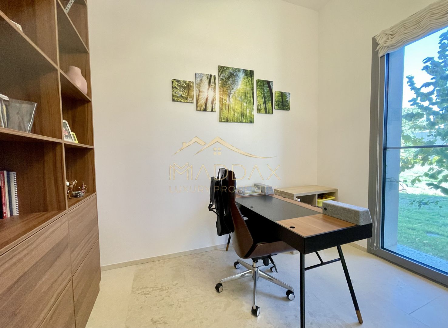 Vila, cu s. u. de 300 mp si teren de 2063 mp, impresioneaza prin finisajele de lux, materiale naturale (travertin, lemn) si interiorul rafinat, decorat cu suflet si eleganta. Fiecare incapere se distinge prin cromatica si piesele de mobilier unicate, decoratiuni speciale ce te poarta intr-o poveste frumoasa.