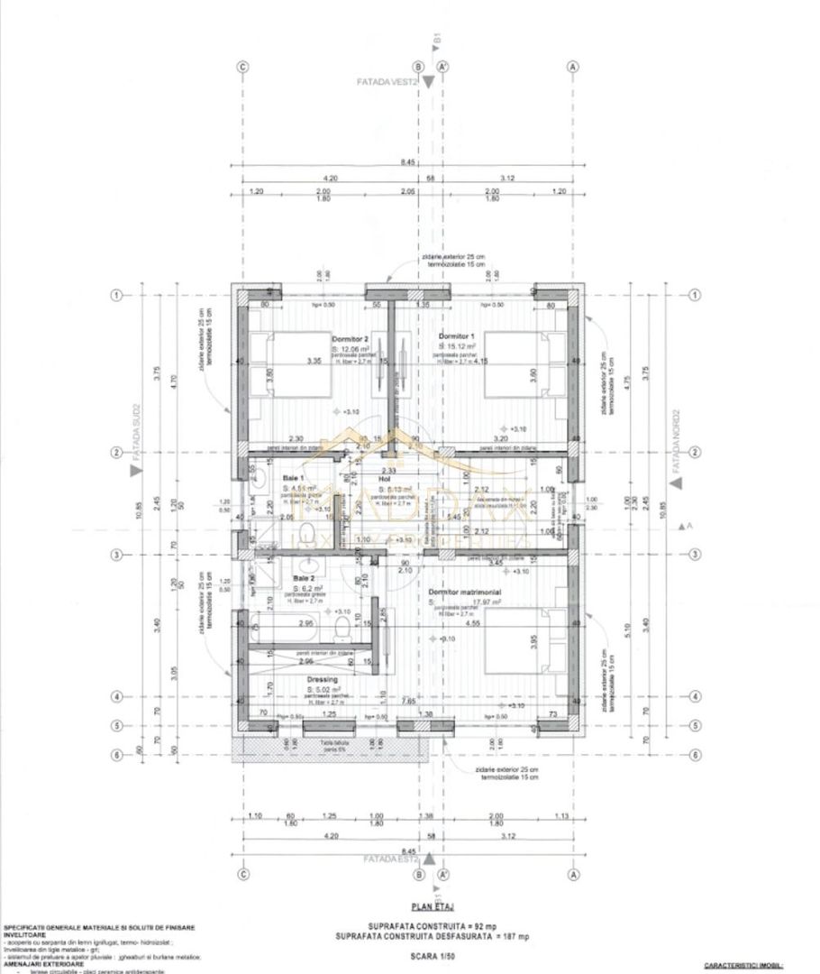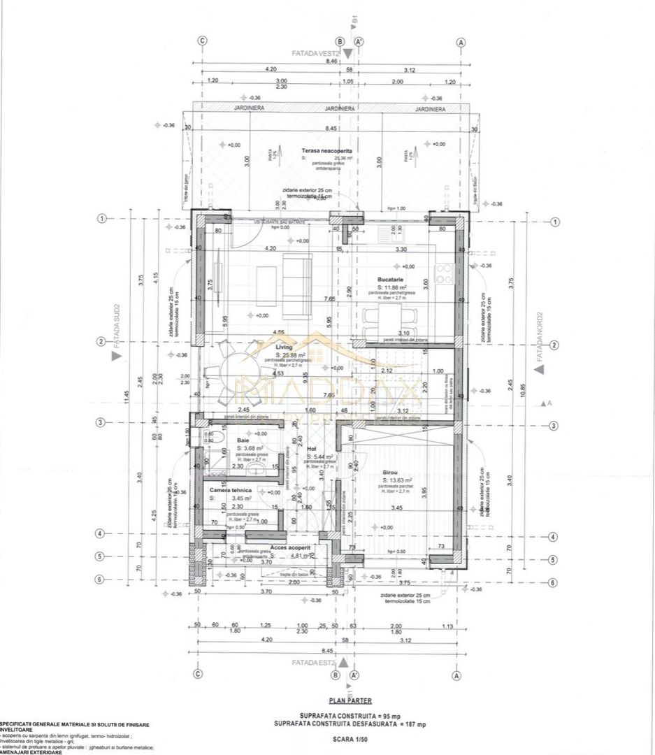 *Constructia este realizata pe fundatii continue din beton armat, structura cu stalpi, grinzi si planseu armat peste parter de 15 cm grosime. *Fundatiile sunt hidroizolate cu bitum pensulat si placate cu polistiren de 5 cm. Zidaria este executata din blocuri ceramice cu grosimea de 30 cm. Invelitoarea este din tigla metalica marca BILKA. Toate compartimentarile interioare sunt din caramida, peretii tencuiti si gletuiti, sapele elicopterizate.