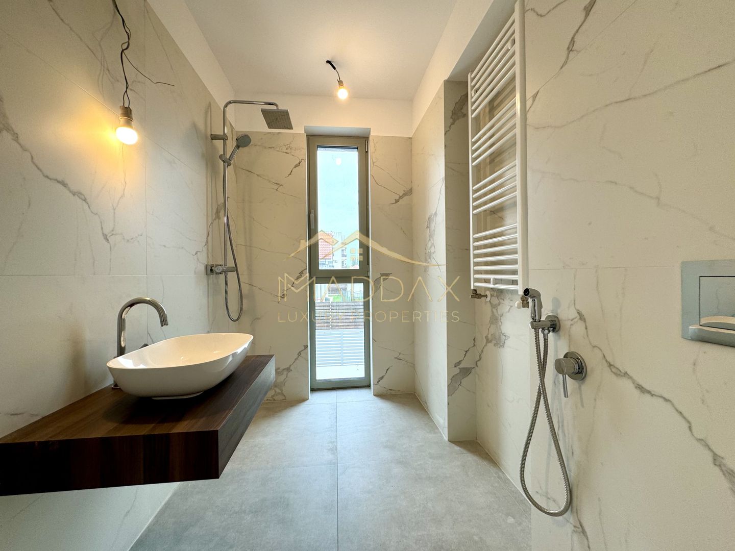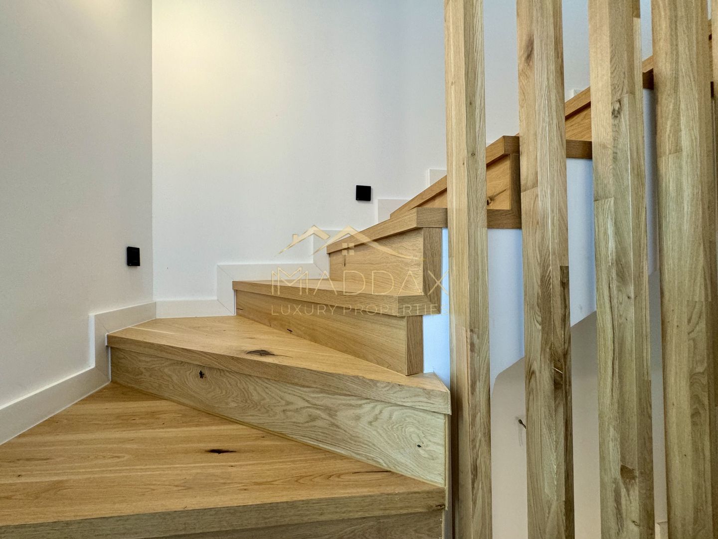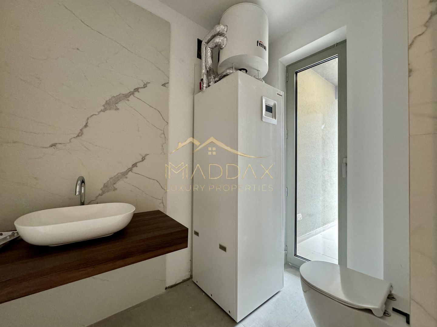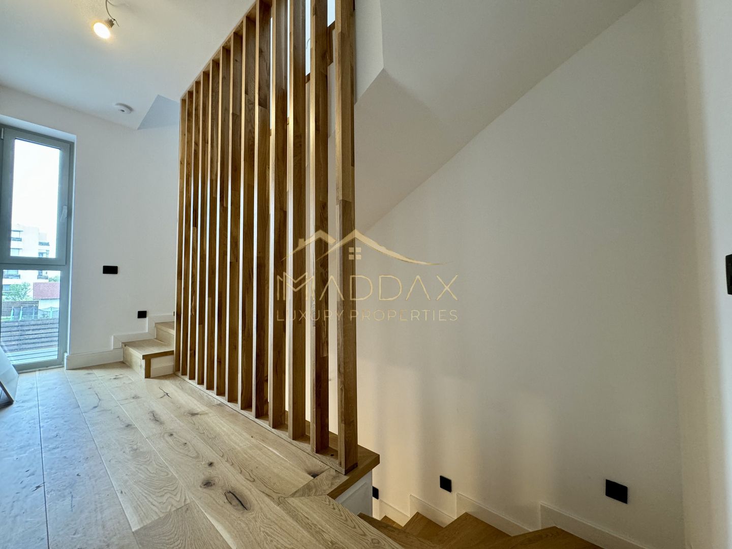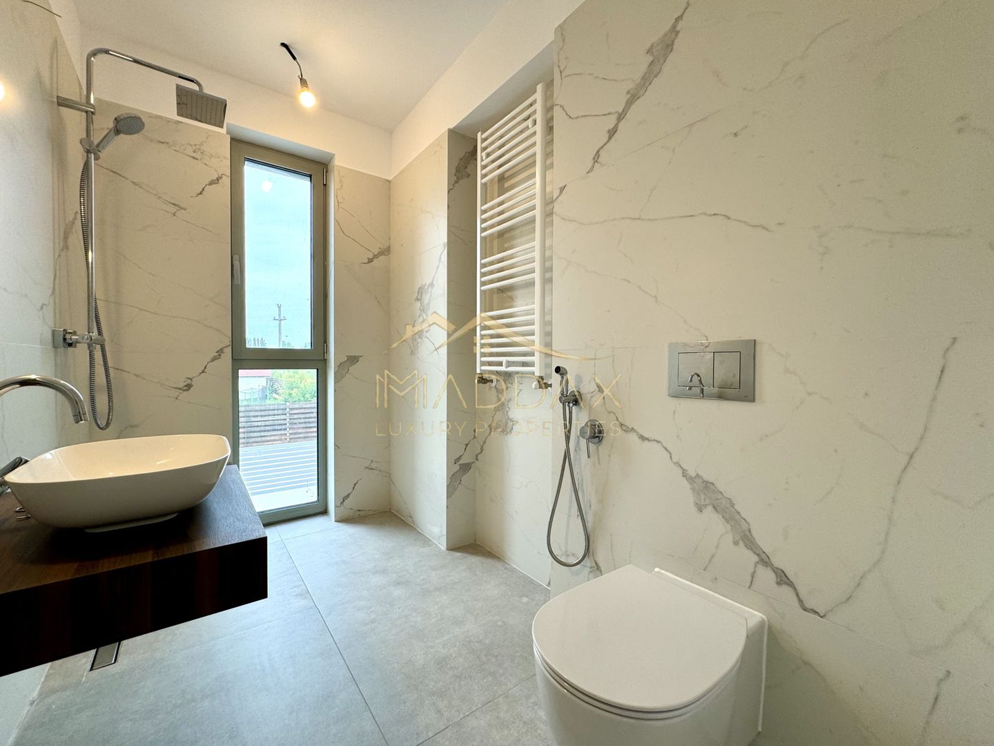 Finisajele sunt moderne, de cea mai înaltă calitate, ceramica Tempini Calacatta, parchet de stejar triplustratificat Barlinek, iar structura este din beton armat si cărămida Porotherm 30cm, fațada polistiren 15cm la exterior, cărămida aferentă, sistem colectare ape pluviale mascat prin fațada, partiții interioare gips-carton cuplu cu sistem antifonic cu vata bazaltică, termosistem mansarda din vata minerală bazaltică de 20cm.
